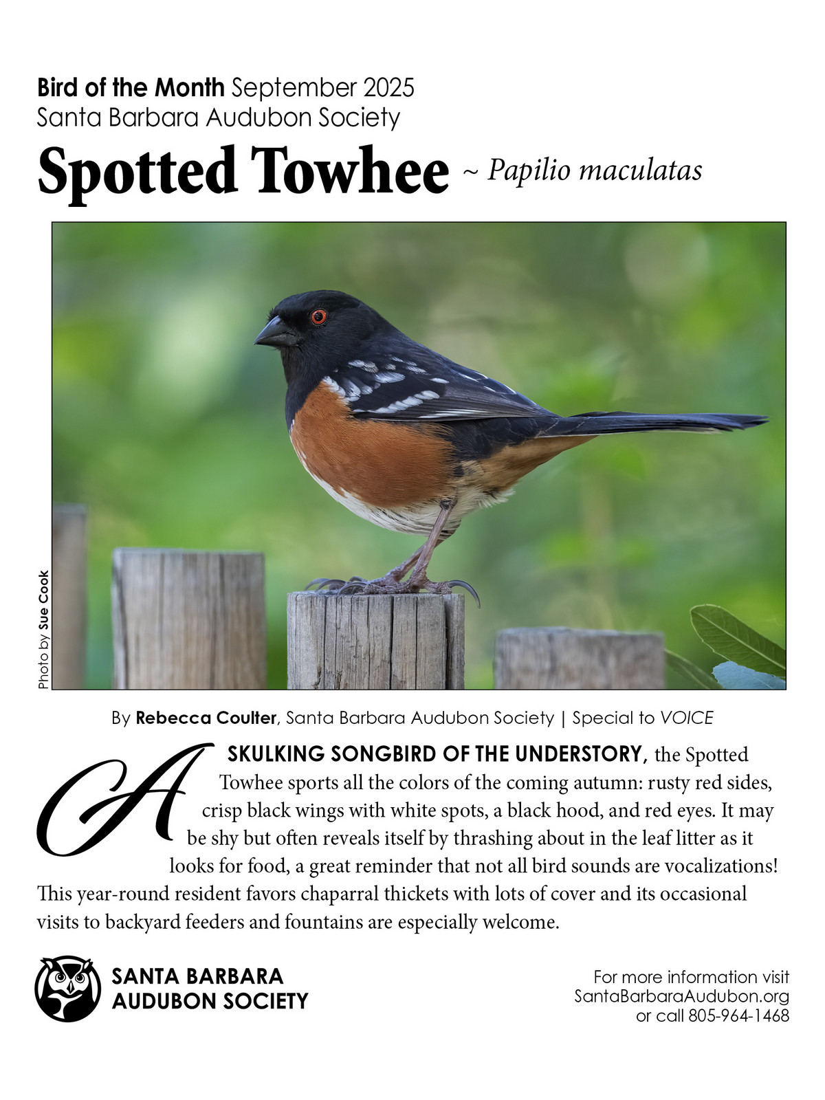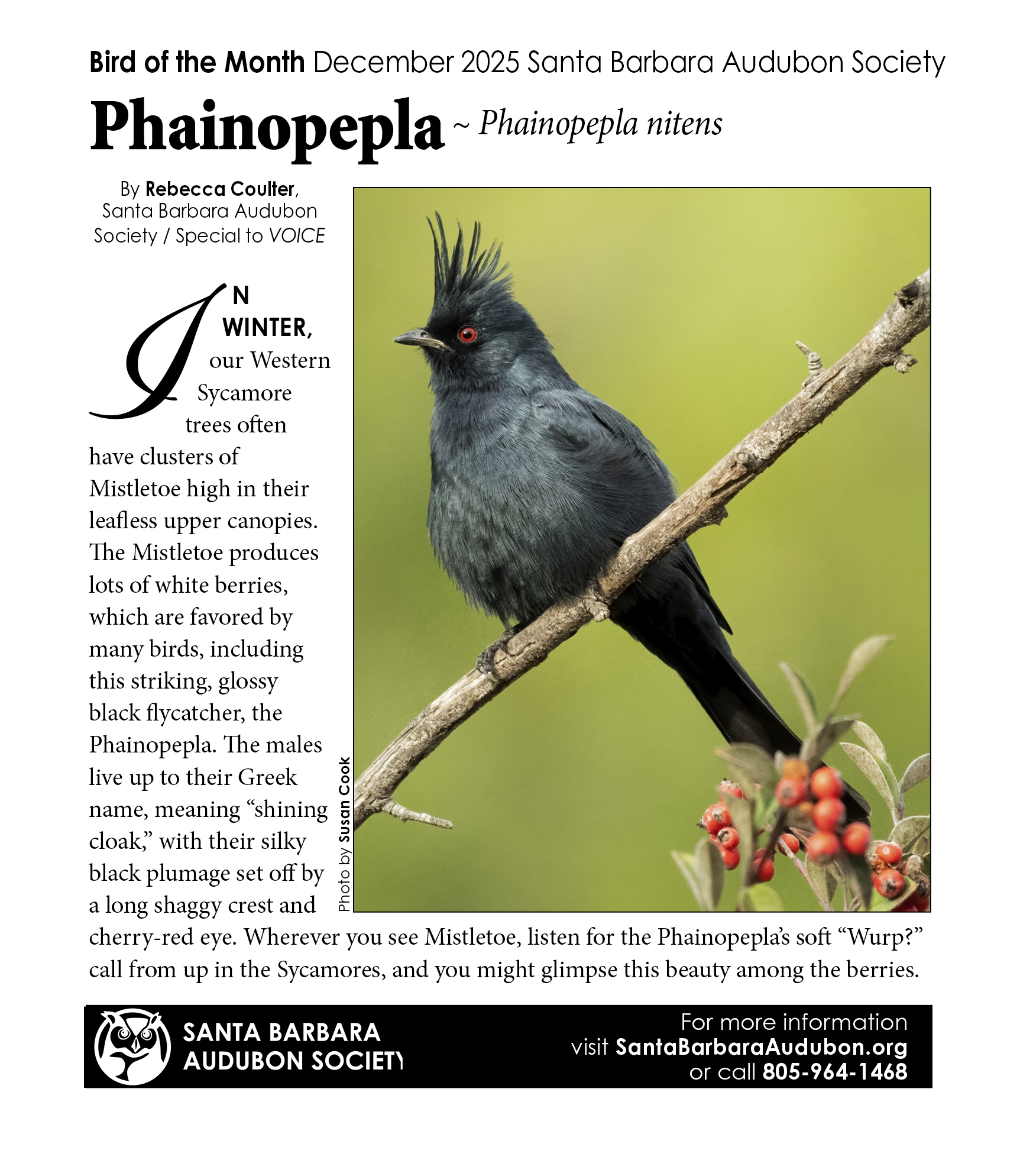 Bird Of The Month is a Santa Barbara Audubon Society educational initiative which appears in print and digitally courtesy of The Voice magazine. Currently all entries are written by Rebecca Coulter and accompanied by beautiful photographs taken by various talented local photographers. On this page we will be keeping an archive of all the published monthly selections.  We hope you enjoy the selections!