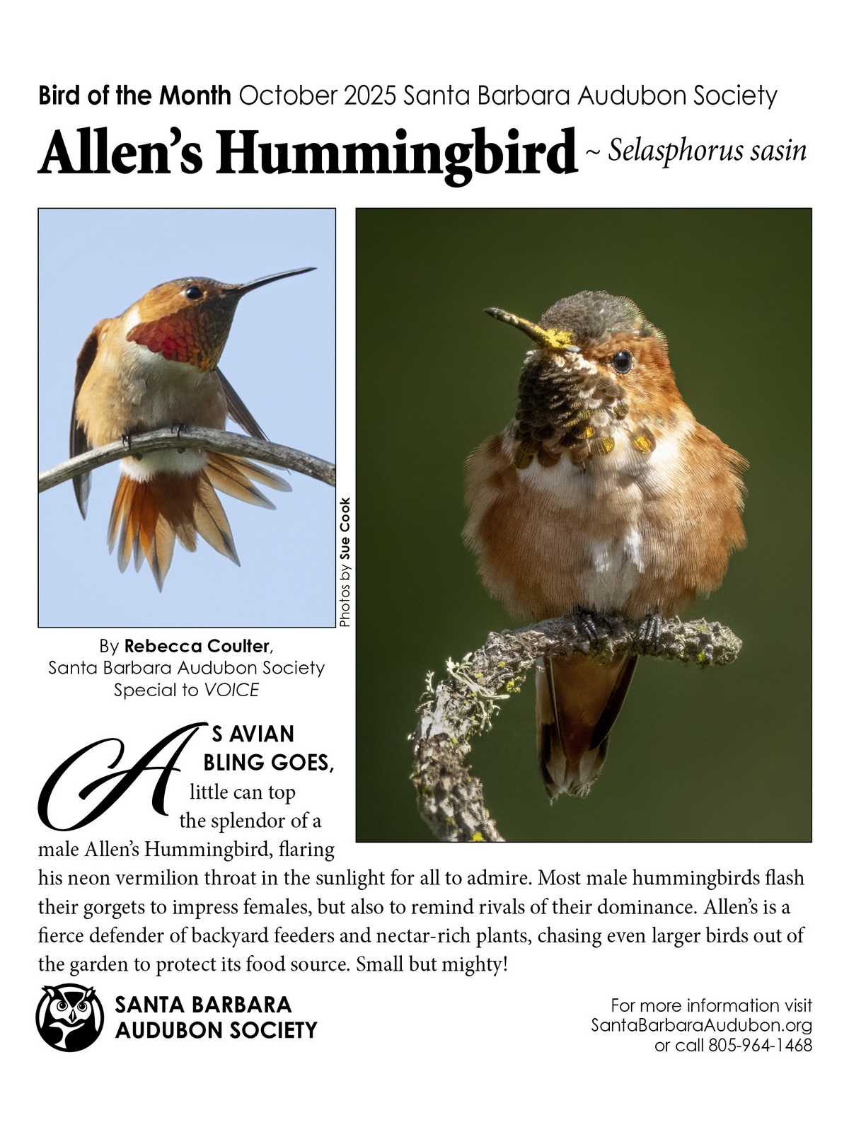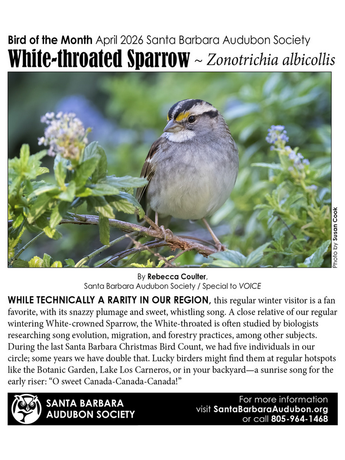 Bird Of The Month is a Santa Barbara Audubon Society educational initiative which appears in print and digitally courtesy of The Voice magazine. Currently all entries are written by Rebecca Coulter and accompanied by beautiful photographs taken by various talented local photographers. On this page we will be keeping an archive of all the published monthly selections. We hope you enjoy the selections!